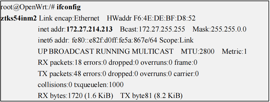 5) 在终端输入 ifconfig 可以看到已经有个新增的 ztks54inm2 设备,IP 地址为 172.27.214.213