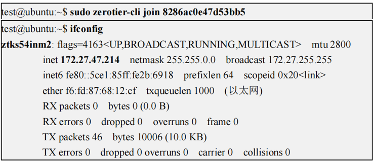 7) 重启后根据 Network ID 加入虚拟局域网,也可以看到已经获取到 zerotier 分配 的 ip 地址,此时该 Ubuntu PC 和 OrangePi R1 Plus 处于同一局域网中,两者可以自由通信