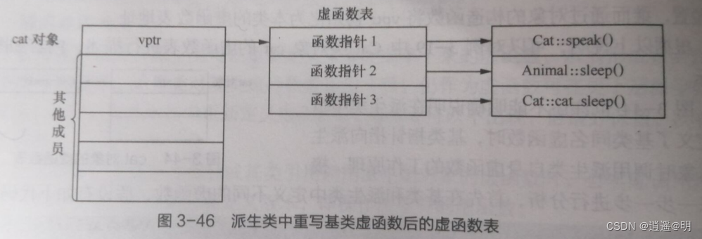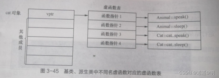 在虚函数表中,编译器将按照该虚函数的声明顺序依次保存虚函数地址,同时在每个带有虚函数的类中放置vptr指针,用来指向虚函数表