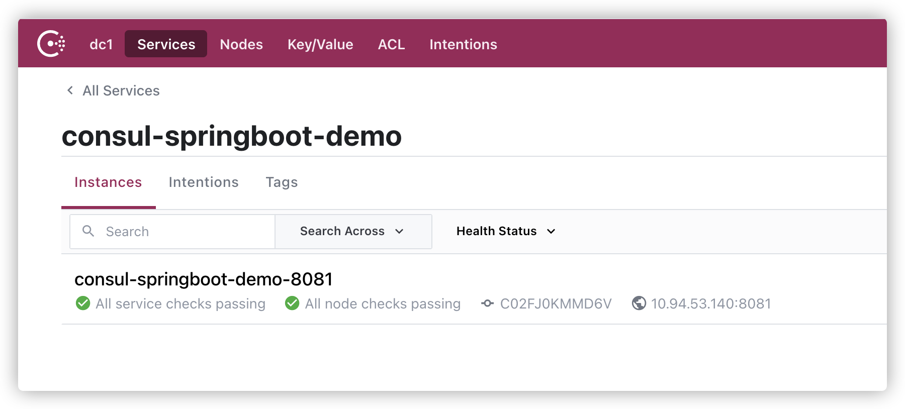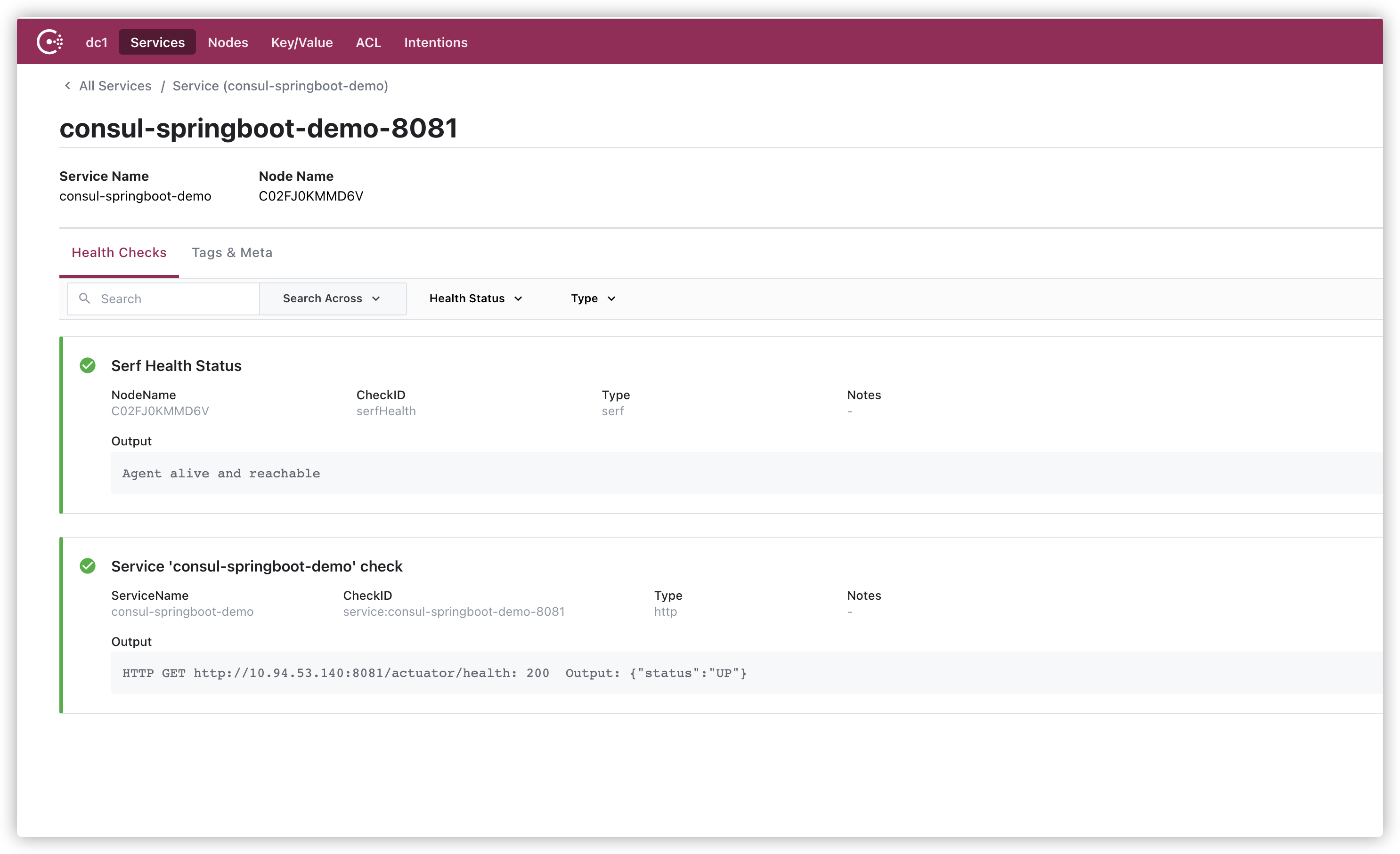 2021-05-19 11:47:13.015 INFO 23711 --- [ main] o.s.c.c.s.ConsulServiceRegistry : Registering service with consul: NewService{id='consul-springboot-demo-8081', name='consul-springboot-demo', tags=[], address='10.94.53.140', meta={secure=false}, port=8081, enableTagOverride=null, check=Check{script='null', dockerContainerID='null', shell='null', interval='10s', ttl='null', http='http://10.94.53.140:8081/actuator/health', method='null', header={}, tcp='null', timeout='null', deregisterCriticalServiceAfter='null', tlsSkipVerify=null, status='null', grpc='null', grpcUseTLS=null}, checks=null}