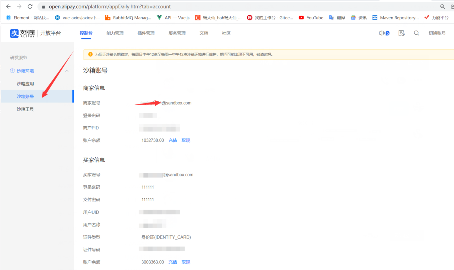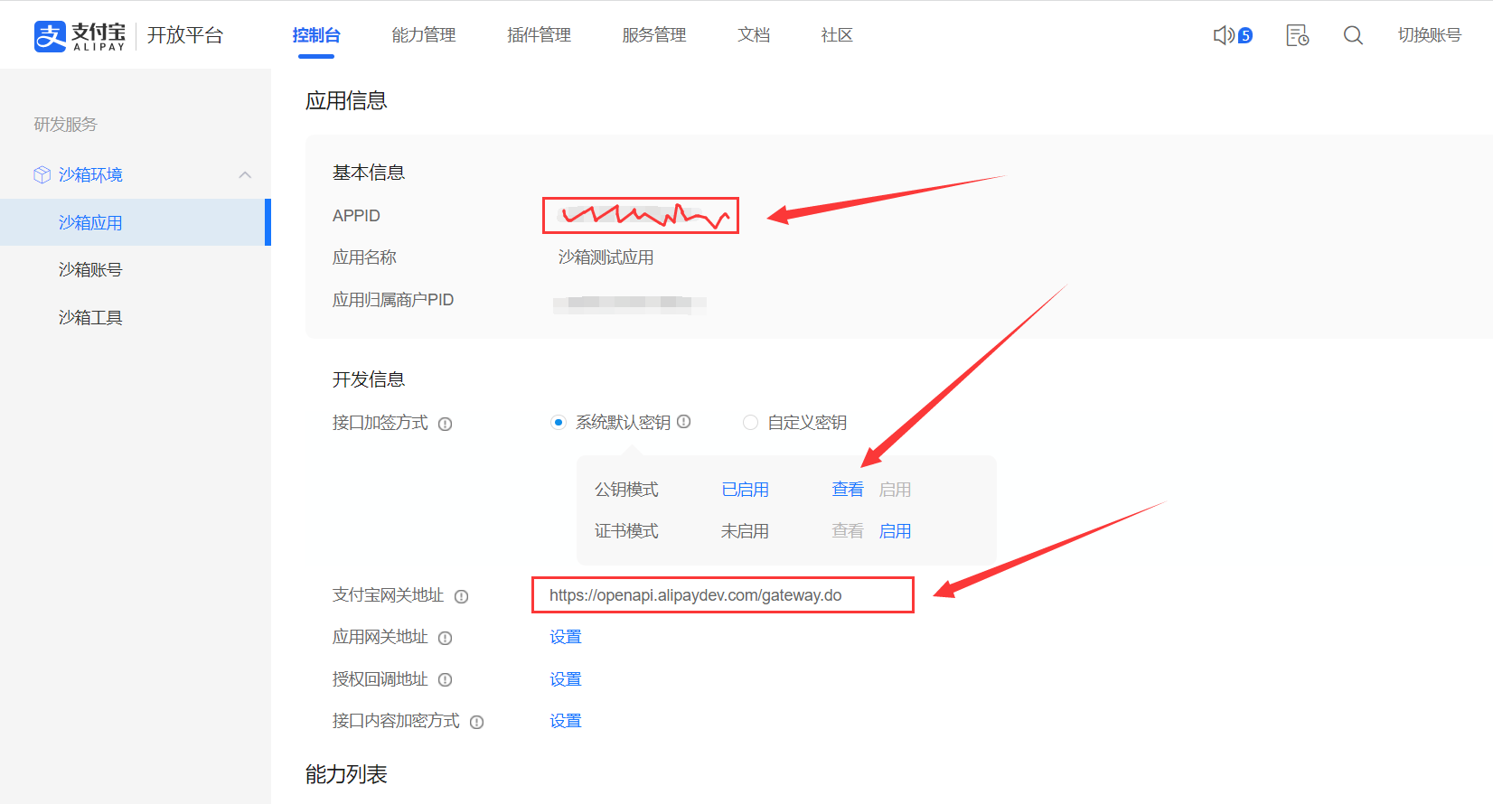 - 将配置类中的各参数替换为如下图所示的沙箱应用中的信息