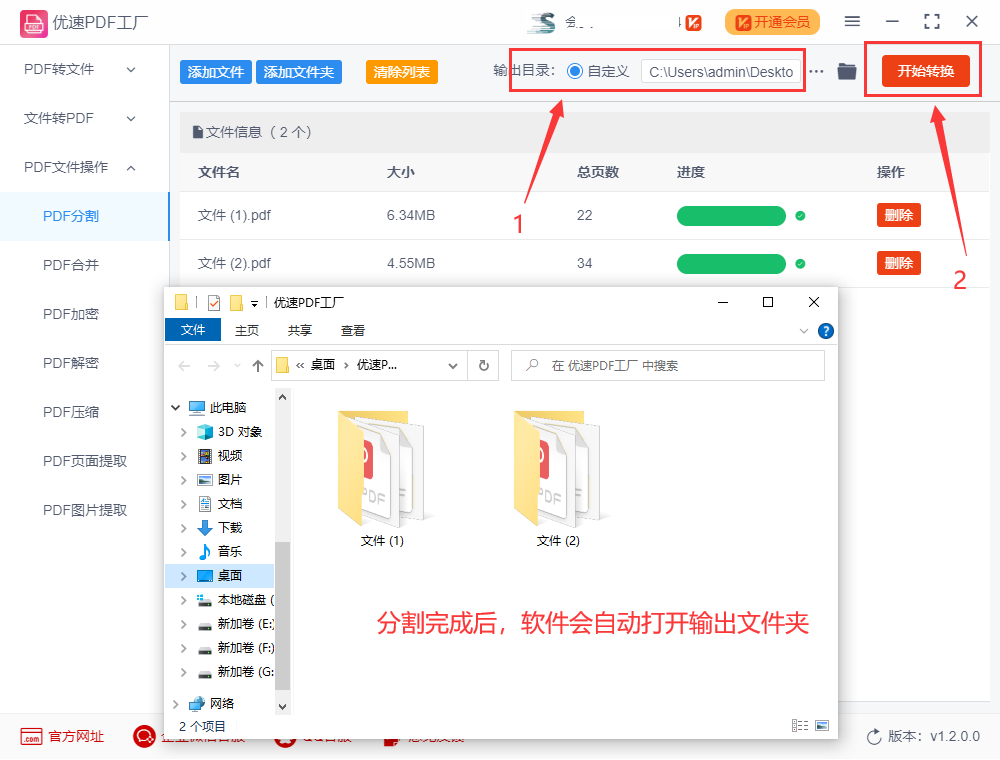 步骤三:拆分前我们先设置输出目录,用来保存拆分后的文件;最后上述步骤无误后,点击右边的【开始转换】红色按钮,软件进行拆分,待到拆分结束,软件会自动弹出保存了拆分后文件的输出文件夹。