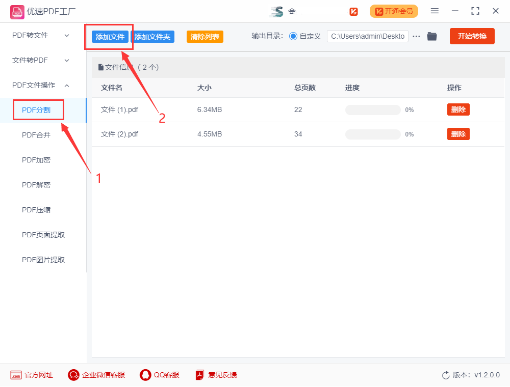 步骤二:进入【PDF文件操作】功能内页,选择左列表中的【PDF分割】功能并点击;接着通过点击【添加文件】按钮,把提前准备好的pdf文件导入到软件中,准备拆分。(此软件支持批量pdf拆分工作,提高工作效率)