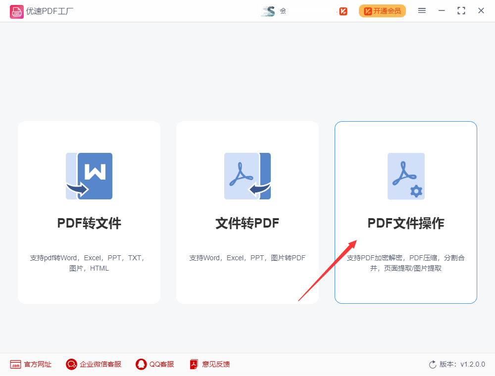 步骤一:用电脑下载安装好pdf拆分工具“优速PDF工厂”,随后打开,点击首页面的【PDF文件操作】功能选项,进入【PDF文件操作】功能内页,里面有有pdf分割功能。