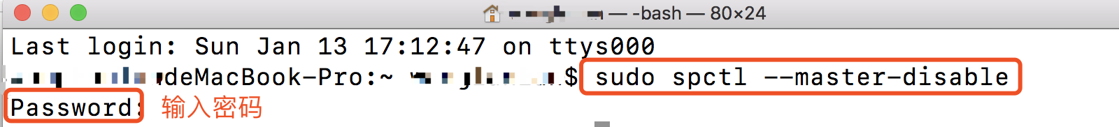 【2】在终端控制台中输入:sudo spctl --master-disable,回车,如果你的笔记本设置有开机密码,会提示要你输入密码,输入的整个过程中是看不到密码显示的,不要因为看不到输入的密码而着急,继续输入完密码后按下回车键。