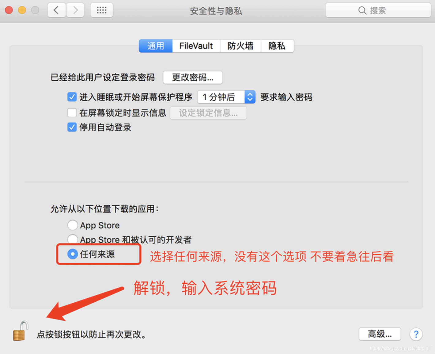 【3】打开系统偏好设置——>安全性与隐私,显示了任何来源,然后点击允许来自任何来源。如果没有【任何来源】的选项,可以再次执行【1】中的代码进行尝试。