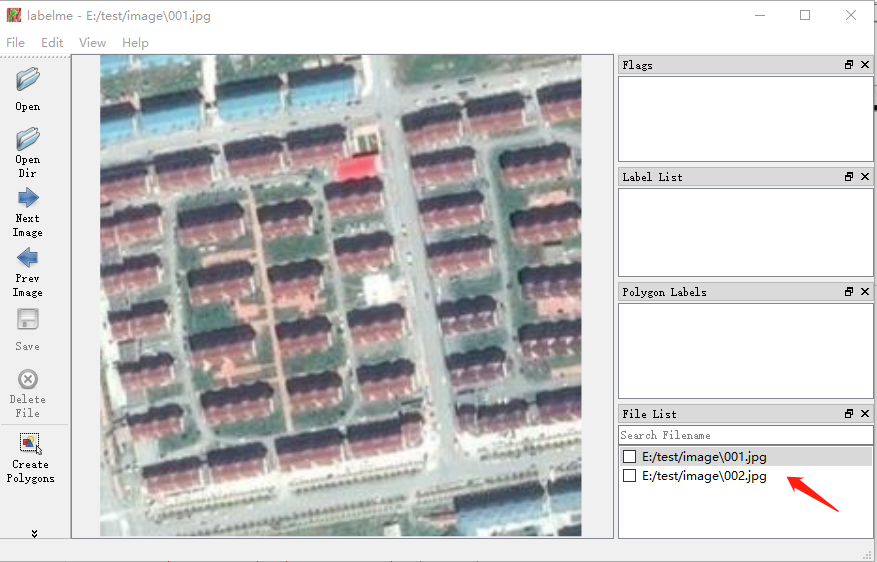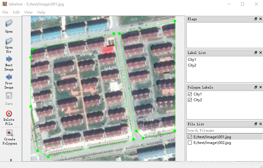 点击左下角的CreatePolygons,单击鼠标左键添加多边形顶点,Ctrl+Z撤销上一个顶点,最后点击起始点完成多边形的选择,弹出命名框。同一类下有多个实体对象时,如城区对象时,用City1,City2区分,Ctrl+S保存生成json文件,同时右下角文件目录下该图像前打钩显示已标注,如图5所示。