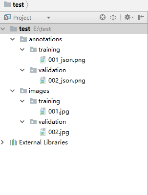 在images和annotations下新建文件夹training和validation,将之前的原始图片和标签图片分为训练集和测试集,同名文件夹下原始图和标签图一一对应,如图10所示。