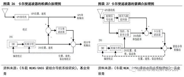 松耦合滤波器采用位置、速度量测值和解算的位置速度之差作为组合导航滤波器输入,也即卡尔曼滤波器的量测量。紧耦合的数据包括GNSS的导航参数、定位中的伪距、距离变化等。