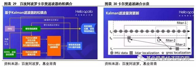 以百度阿波罗使用的惯导系统为例,采用了松耦合的方式,并且使用了一个误差卡尔曼滤波器。惯性导航解算的结果用于Kalman滤波器的时间更新,即预测;而GNSS、点云定位结果用于Kalman滤波器的量测更新。Kalman滤波会输出位置、速度、姿态的误差用来修正惯导模块,IMU期间误差用来补偿IMU原始数据。