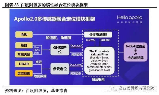 以百度阿波罗的多传感器融合定位系统解决方案为例,惯性导航系统处于定位模块的中心位置,模块将IMU、GNSS、Lidar等定位信息进行融合,通过惯性导航系统解算修正后最终输出满足自动驾驶需求的6个自由度的高精度位置信息。