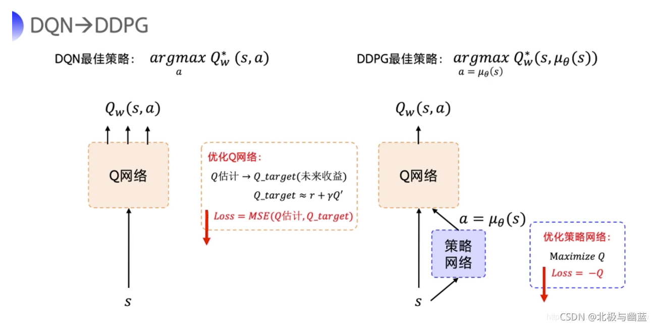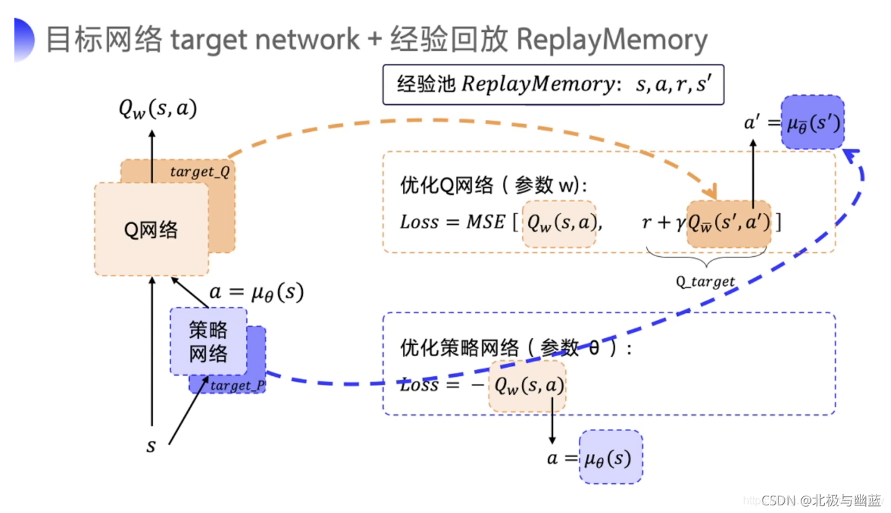 可以看作是DQN的改进,在DQN的Q网络基础上引入Actor网络预测一个使Q值最大的动作值,从而能够应对连续动作空间,且使用了DQN中的目标网络和经验复现技巧。
