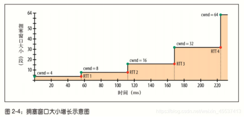 如图可见,一个请求需要经过220ms才可以达到最大速率。因为慢启动限制了可用的吞吐量,对于小文件的传输是很不利的。慢启动重启:在连接空闲一段时间后,重置拥塞窗口到一个安全的默认值。毫无疑问,SSR对于长周期空闲而突发请求的TCP连接有很大的影响。