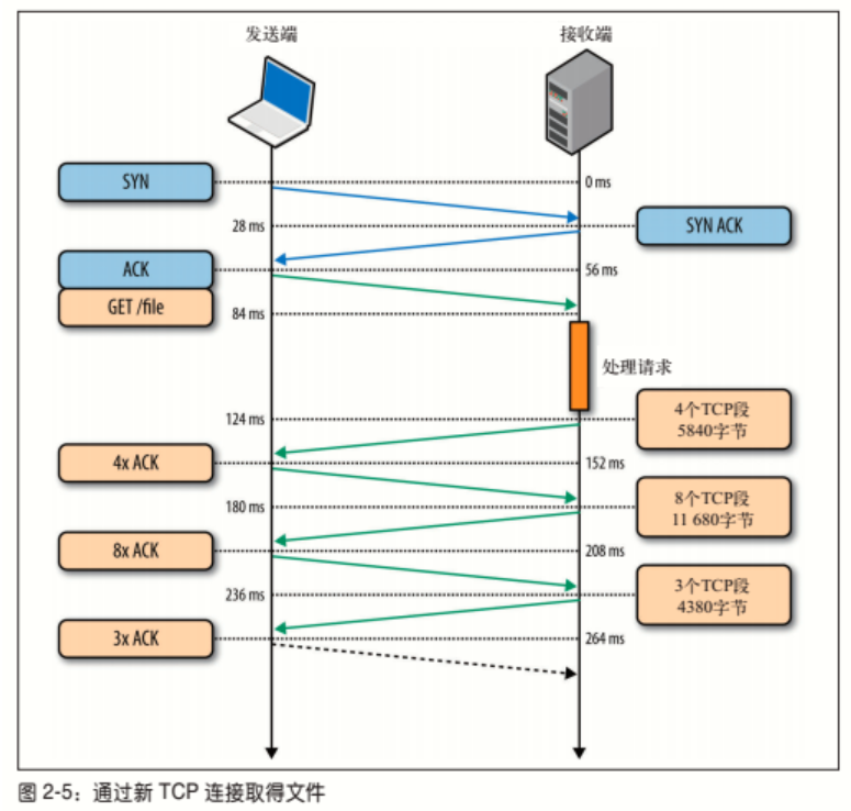 每个http连接都需要经过三次握手,从纽约向伦敦请求,启动一次TCP连接,光三次握手至少要花56ms,向伦敦发送分组需要28ms,响应要28ms。可以看出三次握手带来的延迟是非常大的。