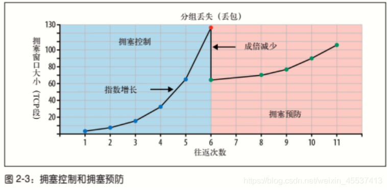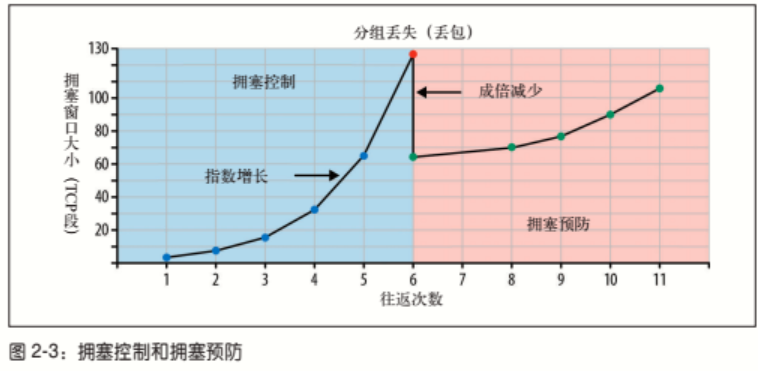 慢启动每次往返都会成倍提高传输的数据量,知道超过接收端的流量控制窗口或者有分组丢失为止。此时拥塞预防算法接入。