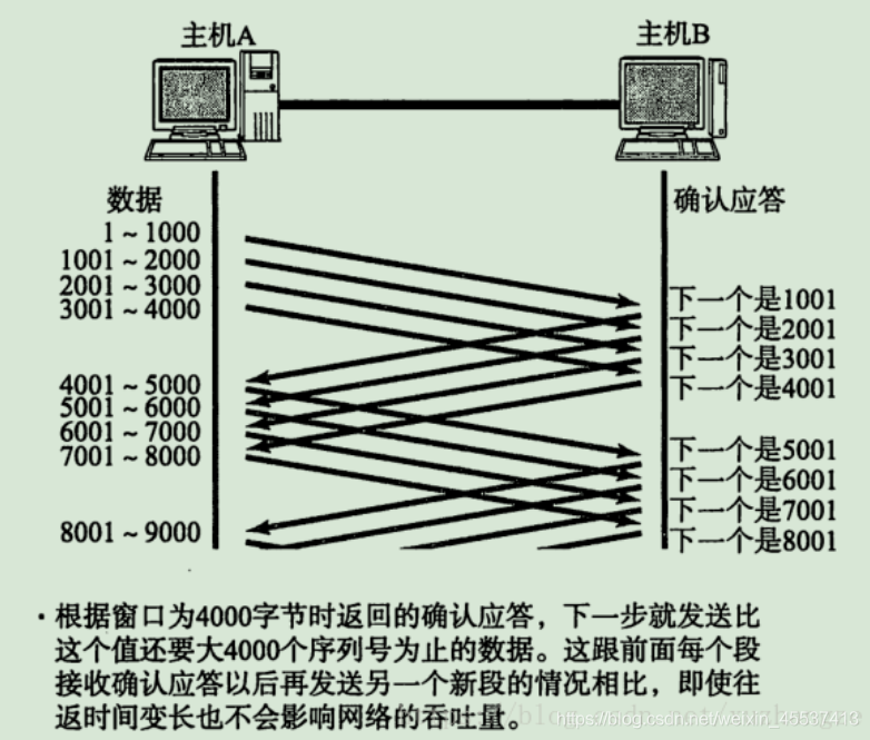 滑动窗口大小:指无需等待确认应答而可以继续发送发送数据的最大值。上图中的滑动窗口大小为4000个byte(即四个数据段)。