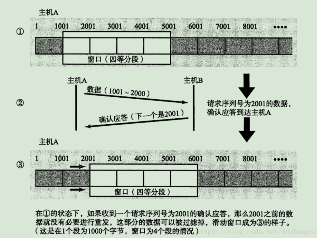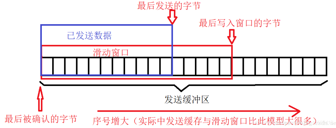 发送前四个段时无需等待任何ACK报文,直接连续发送;收到第一个ACK后,窗口向后移动一个段,发送第五个段,之后以此类推;操作系统为了维护这个滑动窗口,需要开辟一个发送缓冲区,其关系如下: