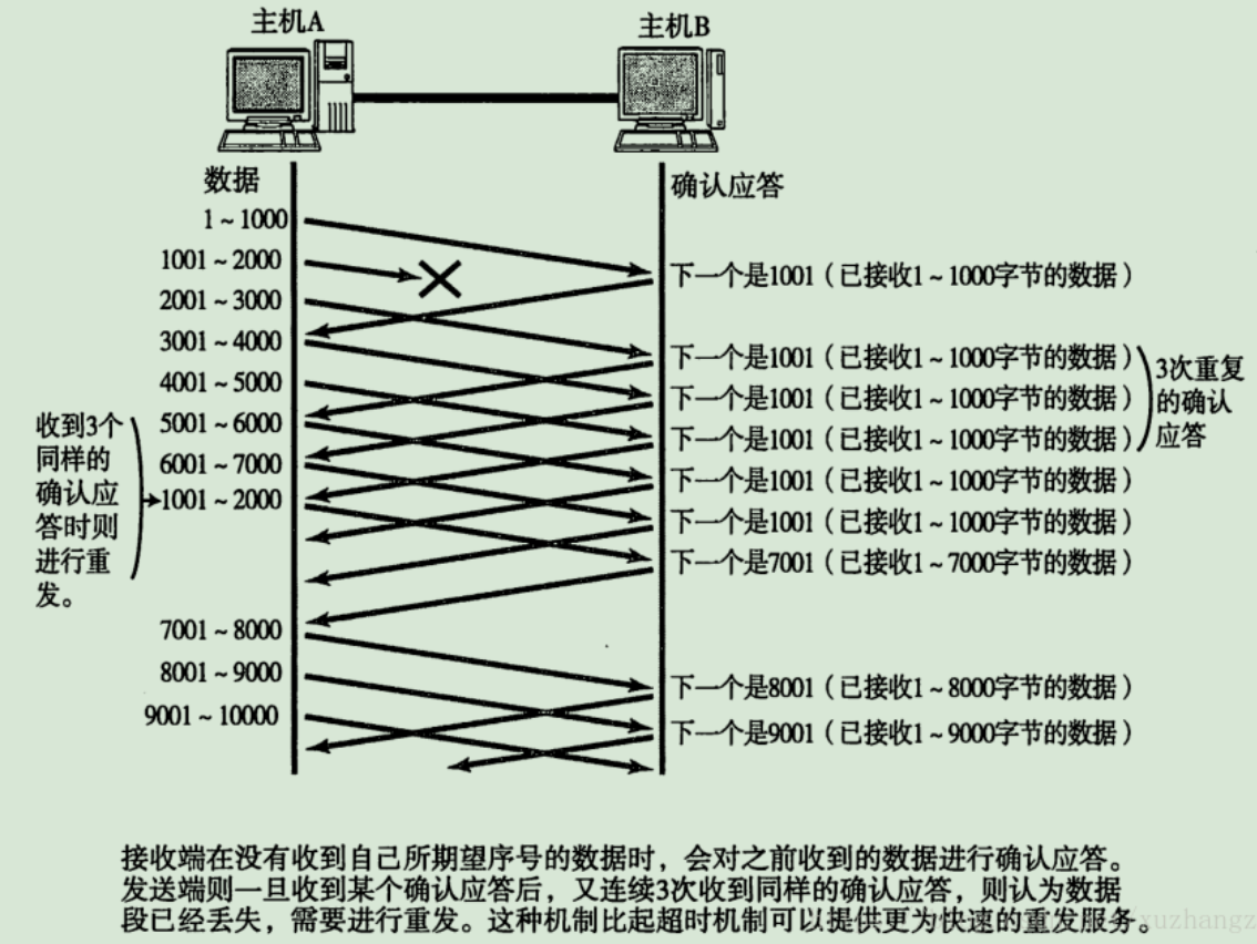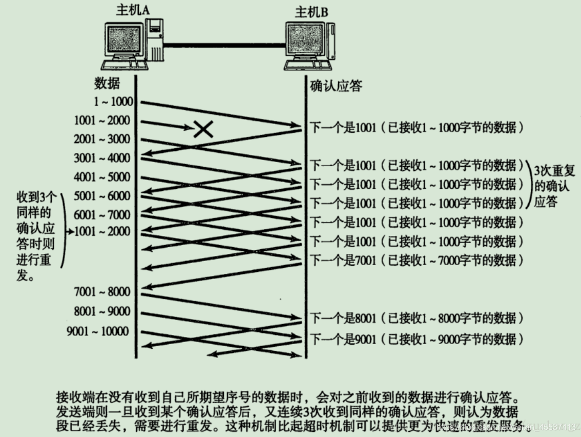 这种情况下报文段没有成功传送到接收方,而因为有滑动窗口机制,所以发送方会继续发送后续报文段。但是接收方每次收到报文都只会对其收到的最后一个“有序”报文段进行确认,这样发送方就会不断地发送被丢失报文段后面的数据段,接收方不断发送对到达的“有序”报文段的最后一个报文段的确认报文,当发送方收到3个同样的确认应答时就进行重发。其过程如下: