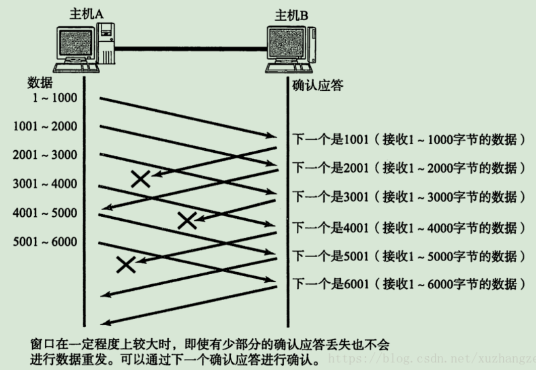 接收方发送出的ACK报文也可能会在中途丢失,这样发送方就可能收不到前面发送的数据的确认报文,但是如果收到了后续报文段的ACK也会认为前面的报文段已经被接收方收到,这样就进行了确认。其过程为: