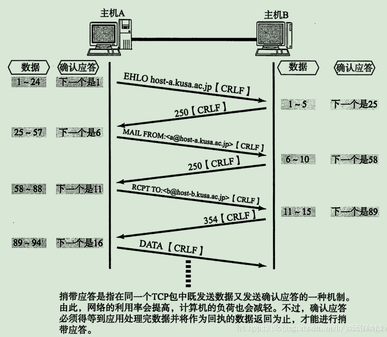根据应用层协议,发送出去的消息到达对端,对端进行处理以后,会返回一个回执。 例如,电子邮件协议的SMTP或POP、文件传输协议FTP中的连接控制部分等。 所以,TCP的确认和应用端的回执数据就被放到了一个数据包内,这种方式就叫捎带应答。如下图:
