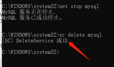 继续在cmd命令行窗口中输入如下命令删除mysql服务