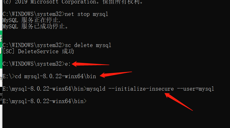 以管理员身份运行cmd,进入mysql的bin目录下,博主的路径为E:\mysql-8.0.22-winx64\bin