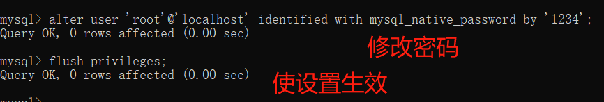 alter user 'root'@'localhost' identified with mysql_native_password by '1234';