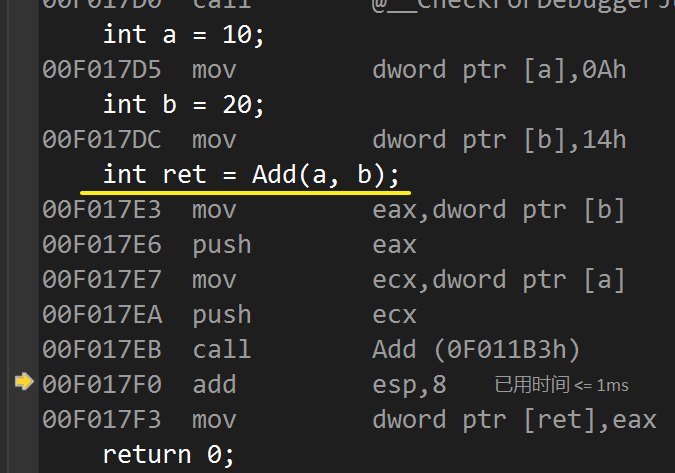 下面要跳转到Add函数,需要先记下 下一条指令的地址(即return 0;这一句所在地址)