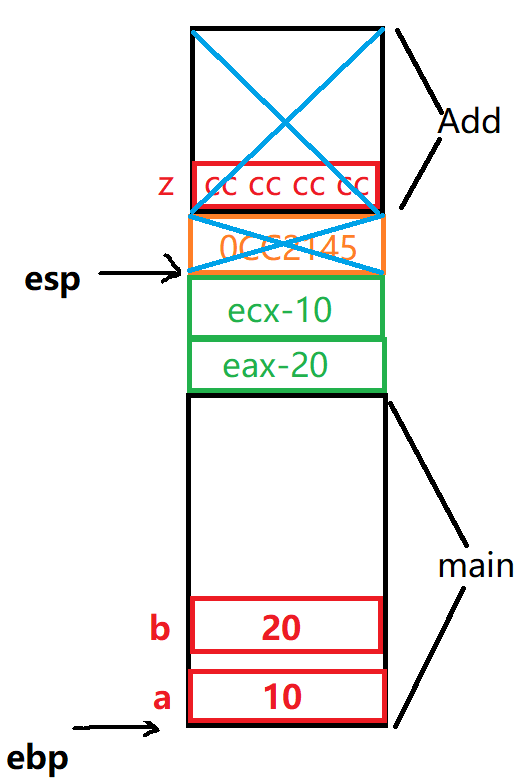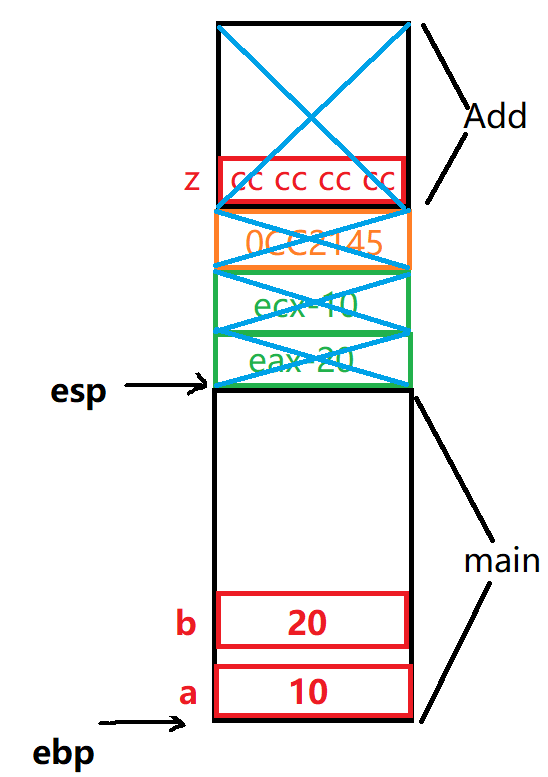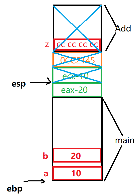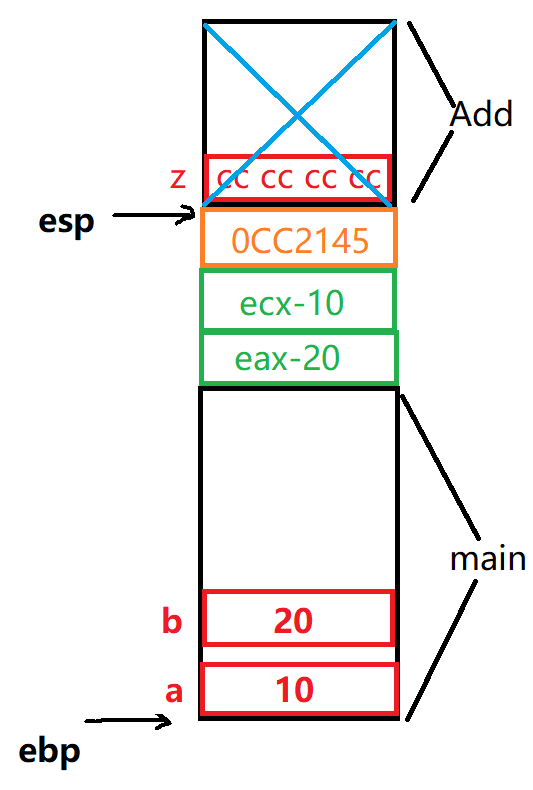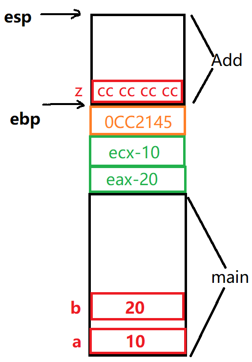到了Add函数中,int z = x+y,声明了一个变量z,所以要在Add的栈上开辟空间存放 z