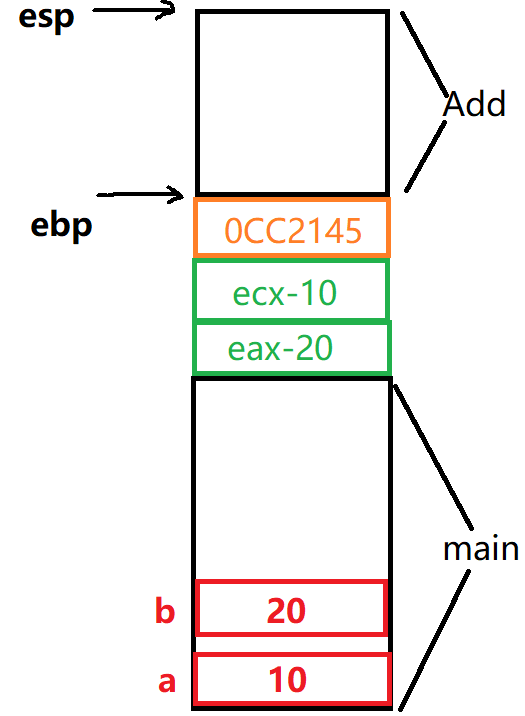 到了开始执行Add函数的时候,从右向左读取实参,将实参的拷贝放入寄存器 push 到栈顶