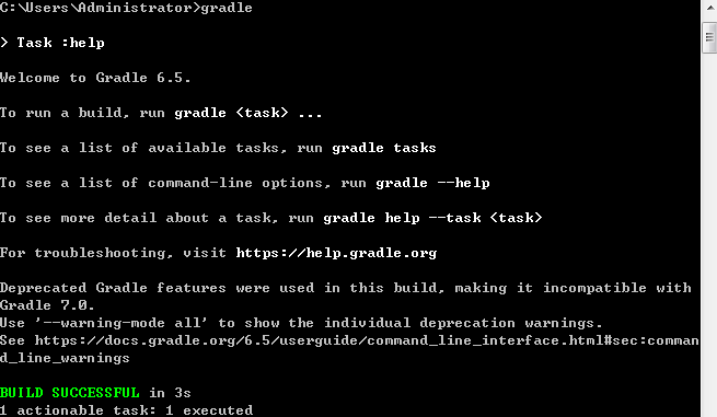 在系统变量的path增加%GRADLE_HOME%\bin,完成环境变量设置,打开cmd输入gradle,验证gradle配置是否正确,出现以下界面表示gradle配置正确
