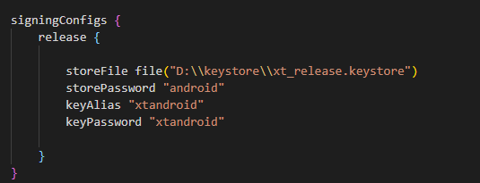 2、编辑gradle.properties(没有这个文件你就创建一个,这个是android工程目录下),添加如下的代码(注意把其中的****替换为相应密码)