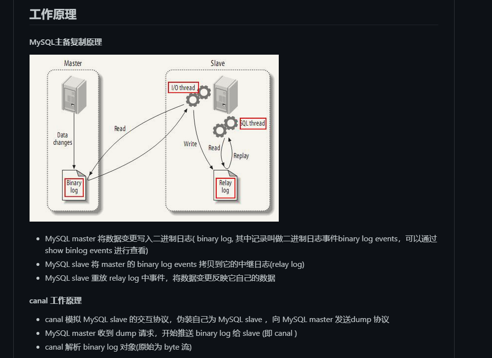 简单的说,mysql的主从复制是从数据库通过bin log把mysql的操作日志按顺序执行。canal把自己模拟成mysql的slave从数据库实现主从复制。