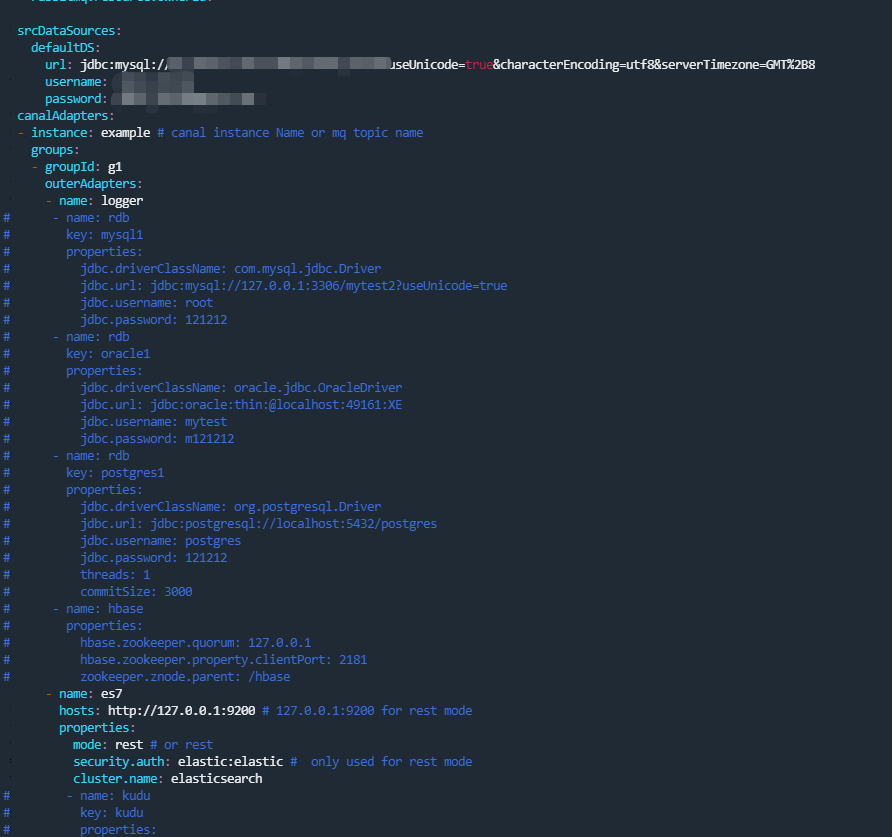 下面开始配置canal.adapter,首先进入conf目录,打开application.yml文件,在文件中配置下面这些信息