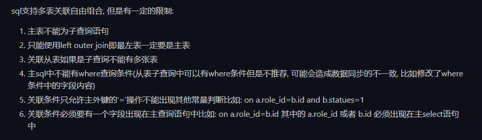 首先通过_index定义映射的索引名称,通过_id定义映射主键,通过relations定义父子文档,里面的name的值决定是父文档还是子文档。下面的sql返回的字段就是所有之前elasticsearch中所定义的字段。这里要注意的是我们映射的sql虽然支持多表但是需要满足下列的限制