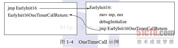 在Reset Vector部分,因为系统还没有RAM,因而不能使用基于栈的程序设计,所有的函数调用都使用jmp指令模拟。OneTimeCall是宏,用于模拟call指令。例如,宏调用OneTimeCall EarlyInit16,如图1-4所示。