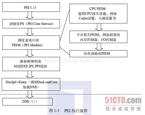 PEI(Pre-EFI Initialization)阶段资源仍然十分有限,内存到了PEI后期才被初始化,其主要功能是为DXE准备执行环境,将需要传递到DXE的信息组成HOB(Handoff Block)列表,最终将控制权转交到DXE手中。PEI执行流程如图1-5所示。