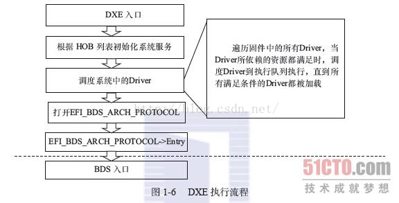 DXE(Driver Execution Environment)阶段执行大部分系统初始化工作,进入此阶段时,内存已经可以被完全使用,因而此阶段可以进行大量的复杂工作。从程序设计的角度讲,DXE阶段与PEI阶段相似,执行流程如图1-6所示。