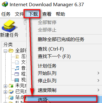 1. 打开IDM.exe软件,根据下图找到IDM软件的设置(下载—>选项)