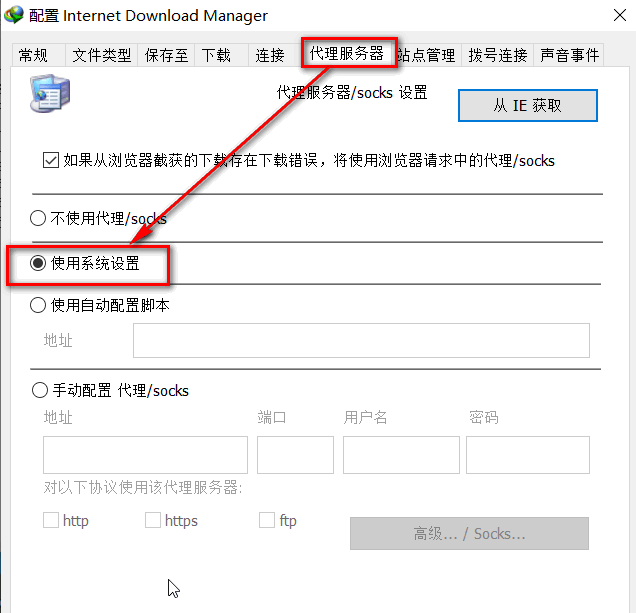 2. 选择“代理服务器”菜单,将IDM软件默认设置的“手动配置 代理/socks”修改为“使用系统设置”即可。