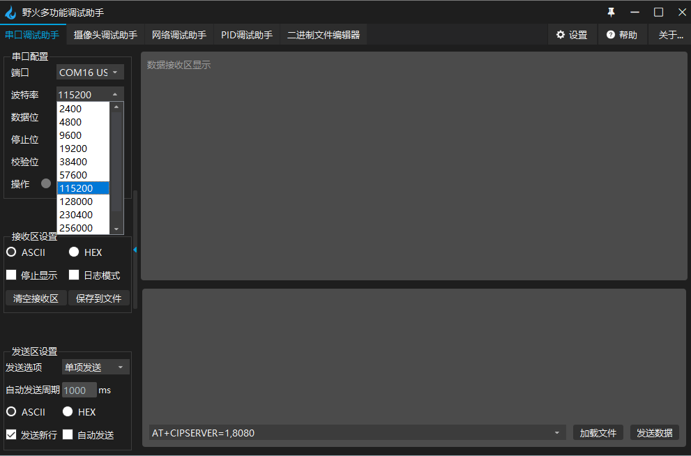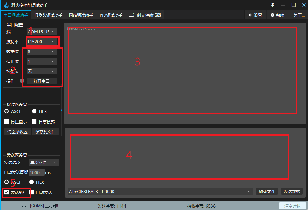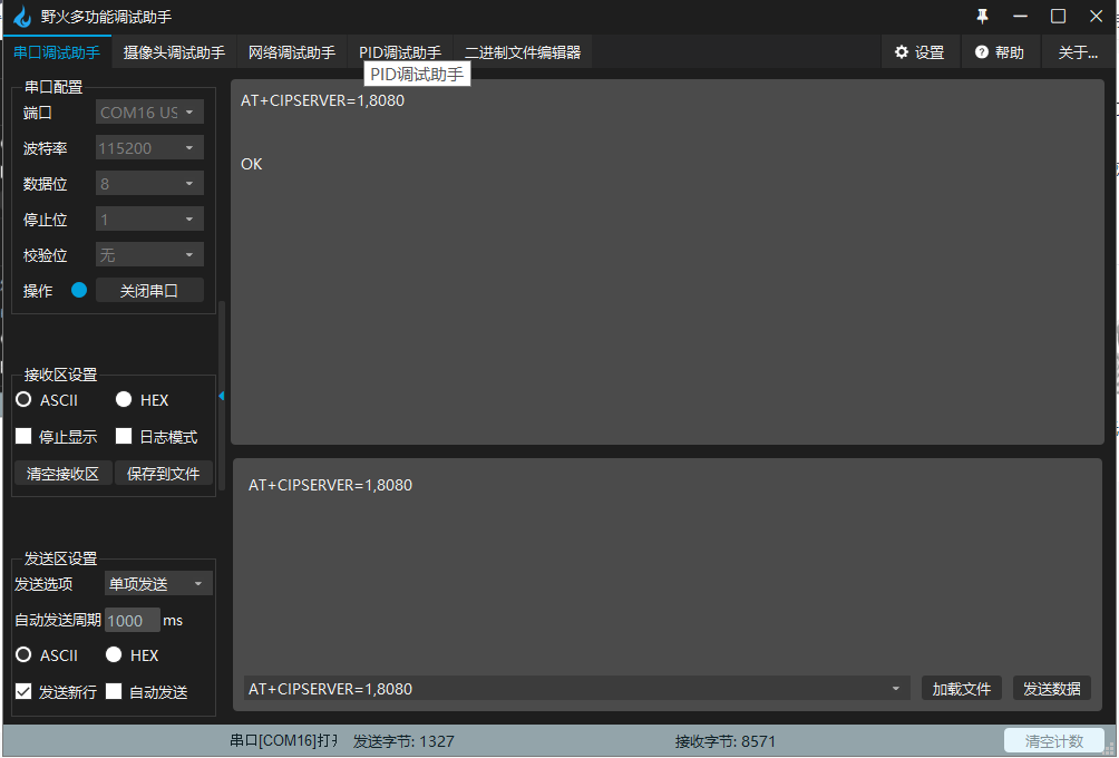 AT+CIPSERVER=1,8080 开启服务器 配置网络助手的一个主要参数