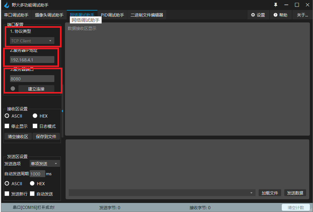 现在我们电脑相对于一个用户,esp8266相对于路由器,所以协议类型选择(TCP Client)表示客户端,IP地址就填写我们上面获得的IP地址,端口号就是,刚刚利用串口助手发送的最后一个参数。