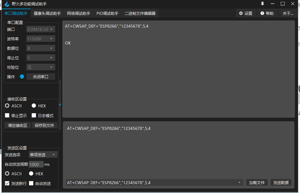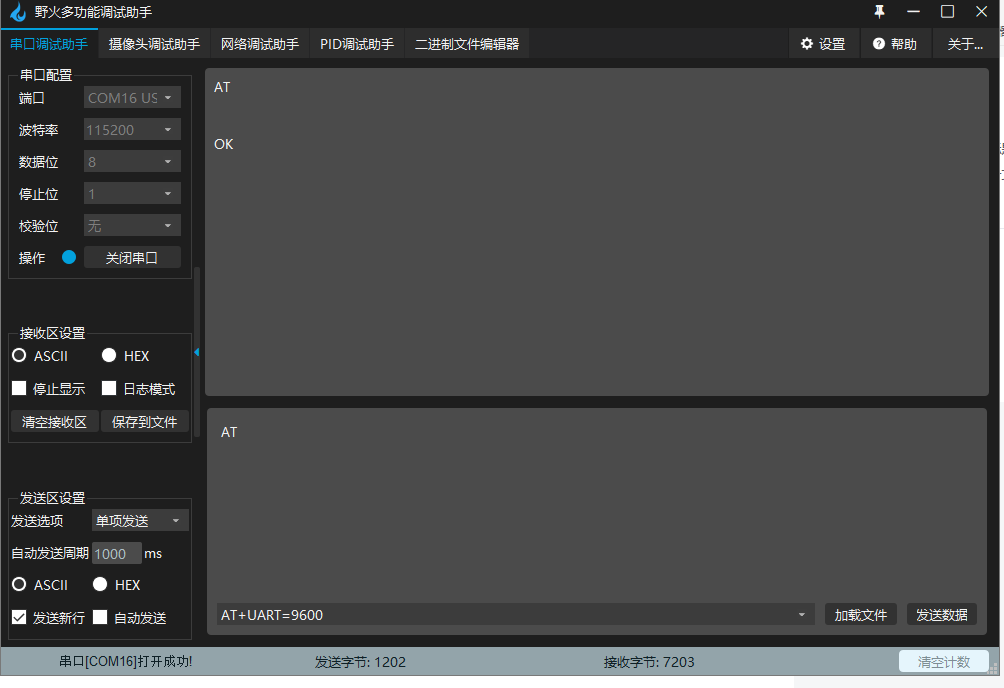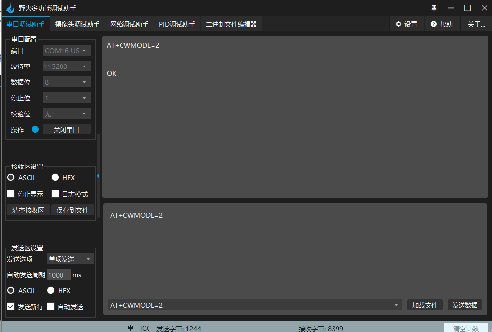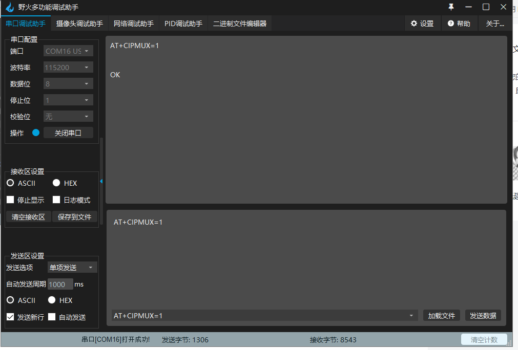 3、接收画面:发送AT指令会在,这个回复我们OK,表示配置成功