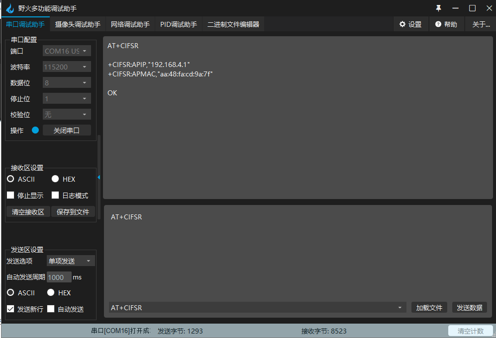 今天先讲利用AT配置成TCP Sever模式(AP模式),也就是是其变成一个路由器,我们电脑,手机,可以连接,然后输入,它的IP地址,就可以用网络串口住助手与其通信了。