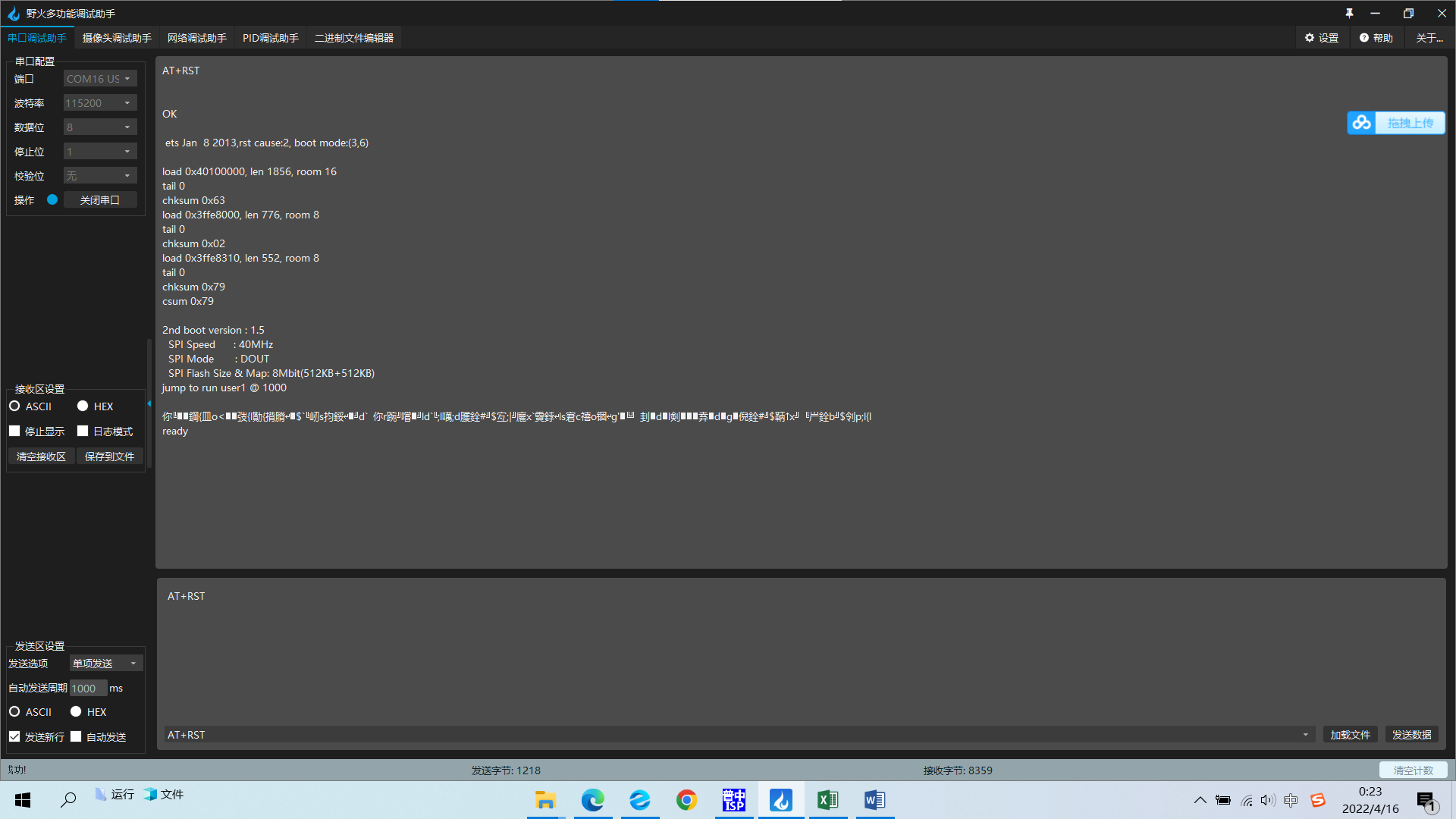 AT+RST指令,回复一大串,用户手册,有具体讲解,我们看到ready:表示复位成功