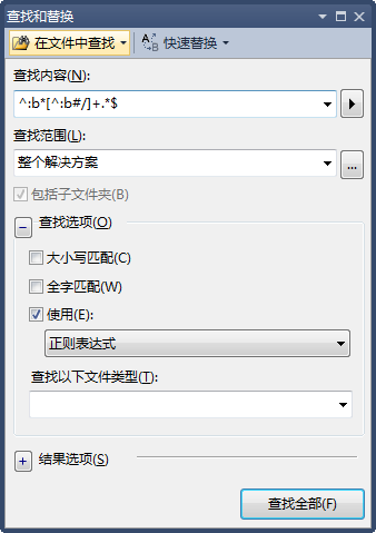 - 在VS中可以在查找页面“查找选项”中选择“使用正则表达式”,“查找范围”选择“整个解决方案”,“查找内容”填写正则表达式“^:b*[^:b#/]+.*$”来统计项目总代码行数。