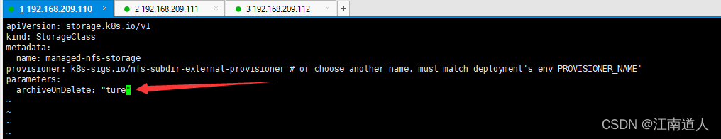 apiVersion: apps/v1kind: Deploymentmetadata:name: nfs-client-provisionerlabels:app: nfs-client-provisioner# replace with namespace where provisioner is deployednamespace: defaultspec:replicas: 1strategy:type: Recreateselector:matchLabels:app: nfs-client-provisionertemplate:metadata:labels:app: nfs-client-provisionerspec:serviceAccountName: nfs-client-provisionercontainers:- name: nfs-client-provisionerimage: lizhenliang/nfs-subdir-external-provisioner:v4.0.1volumeMounts:- name: nfs-client-rootmountPath: /persistentvolumesenv:- name: PROVISIONER_NAMEvalue: k8s-sigs.io/nfs-subdir-external-provisioner- name: NFS_SERVERvalue: 192.168.209.112- name: NFS_PATHvalue: /ifs/kubernetesvolumes:- name: nfs-client-rootnfs:server: 192.168.209.112path: /ifs/kubernetes