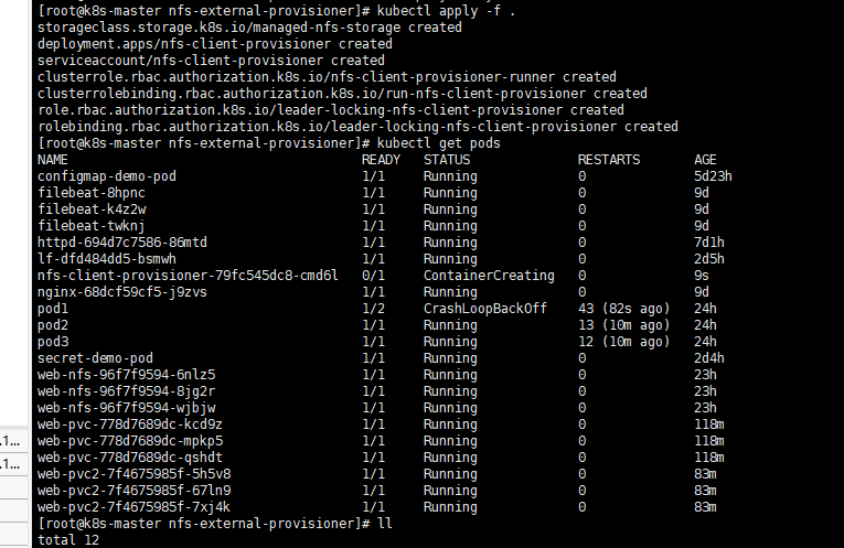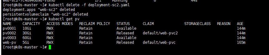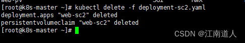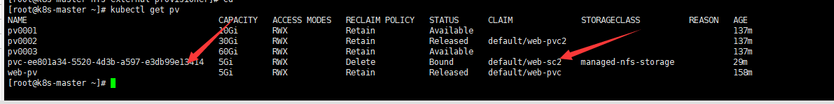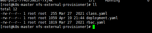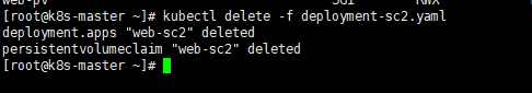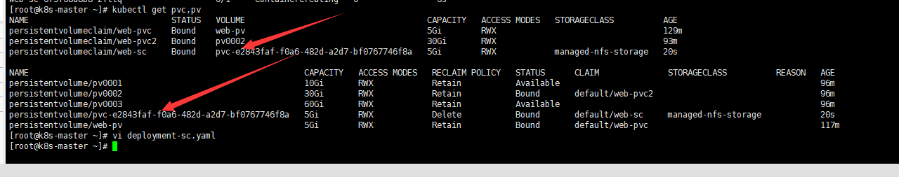 kubectl apply -f deployment-sc.yaml查看pvc,pv,他会自己新建一个pv并绑定申请的pvc,他就是动态供给产生的pv
