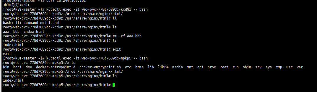apiVersion: apps/v1kind: Deploymentmetadata:name: web-pvc2spec:selector:matchLabels:app: nginxreplicas: 3template:metadata:labels:app: nginxspec:containers:- name: nginximage: nginxvolumeMounts:- name: wwwrootmountPath: /usr/share/nginx/htmlvolumes:- name: wwwrootpersistentVolumeClaim:claimName: web-pvc2---apiVersion: v1kind: PersistentVolumeClaimmetadata:name: web-pvc2spec:accessModes:- ReadWriteManyresources:requests:storage: 15Gi