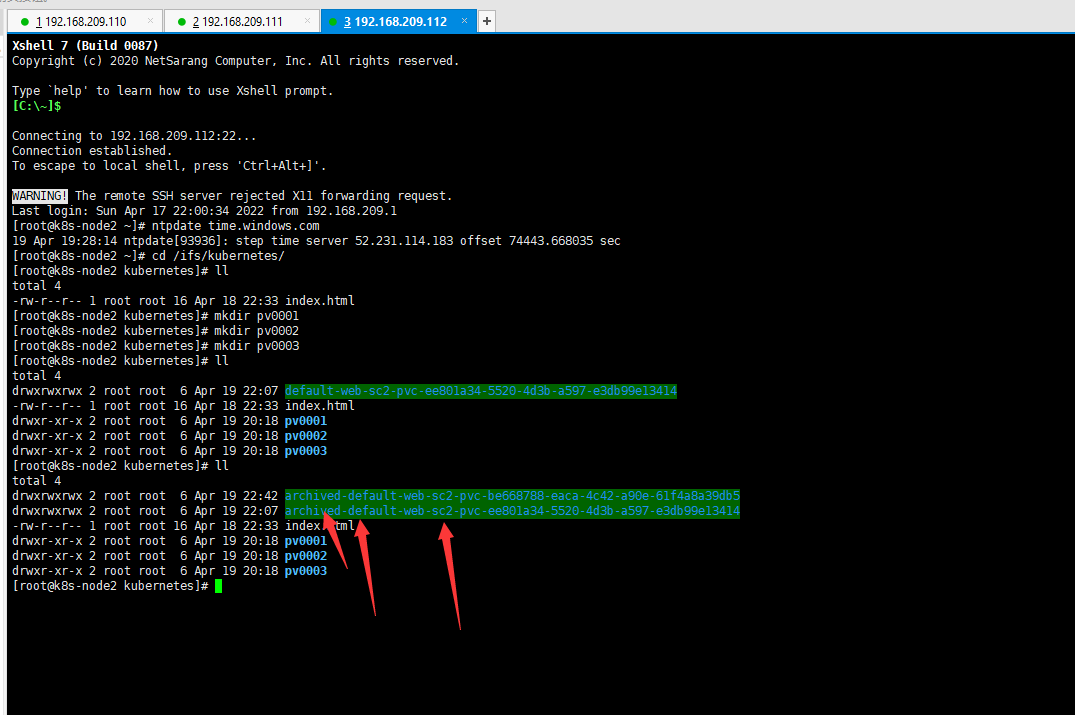 进入nfs服务器 ,发现他持久化的目录还在,加了default前缀归档,,即他状态虽然为delete,在删除pod后pv也会被删除,但在class.yaml中加入了启用归档的配置后,虽然pv会被删除,但在nfs服务器中不会删除这个目录,而会归档
